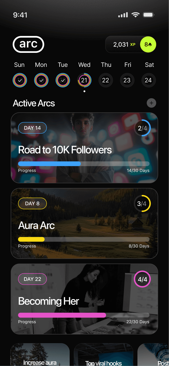Pick from a full library of Arcs. Fitness, content, confidence, glow-up, mindset, then follow the daily system that makes growth feel automatic.